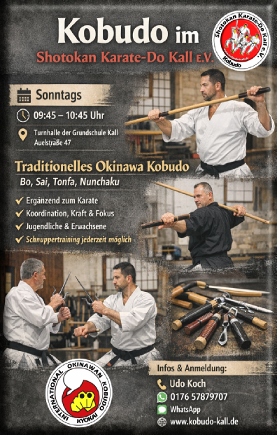 +Training ab dem 11.Januar 2026  Sonntags 09:45-10:45 Uhr   Neue Grundschule Kall Auelstr. 47  Info im Training oder:  Udo Koch 0176 57 87 97 07 (Gerne auch über WhatsApp/SMS) 91 Kobudo Kall